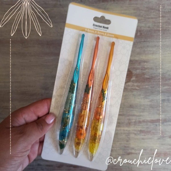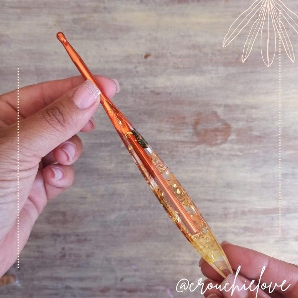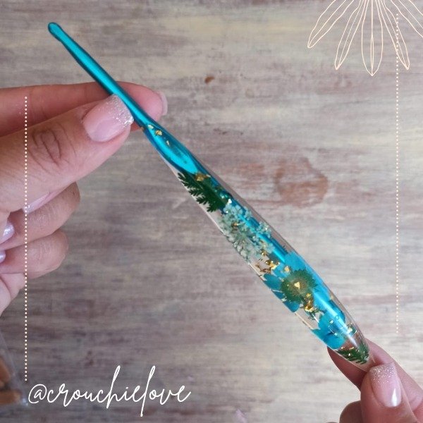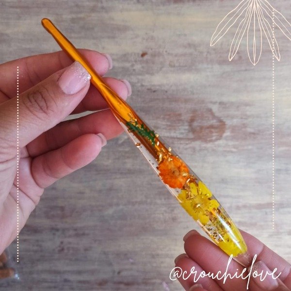 Hermosas agujas crochet con mango de resina. Por dentro, decorada con flores y brillos.